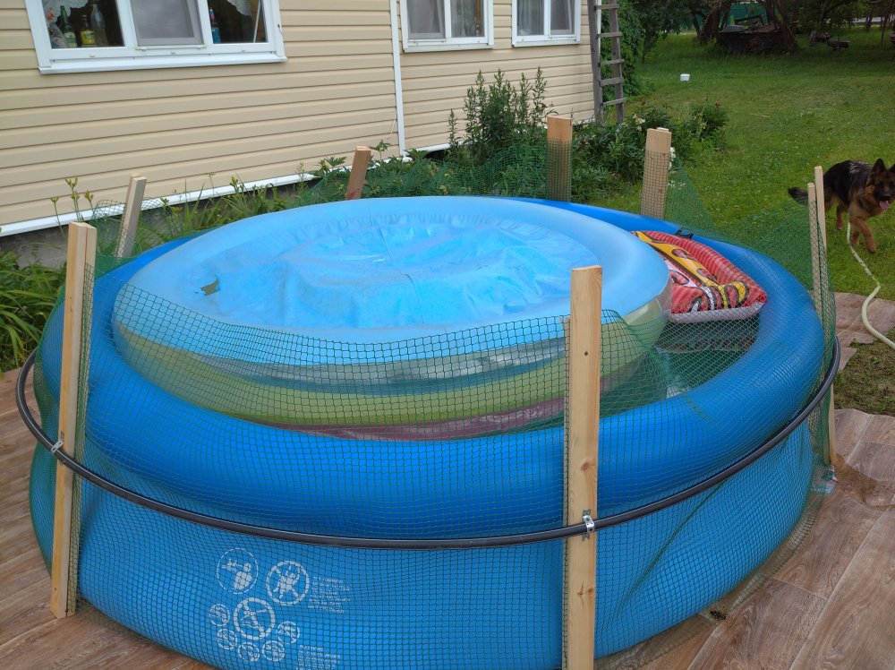 Никольские соседи подарили почти новый бассейн, Диа 305*70 см. Вчера цельный день набирали из колодца. Потом по кругу 6 стоек, пластмассовая рабица от кошаков, по экватору труба ПНД и натяжной потолок на крышу. Интересно, сколько проживет? *** Гидромассажная ванна хорошая, но напрягает запах хлорки. И колодцы напрягают: в старом 60 см, а в новом полтора метра. Для жизни нормально, а бассейн набрать - в несколько приемов. А если ещё уровень грунтовых вод упадет? Позвонил Ямобуру, думает, считает проект +3 ремонтных кольца