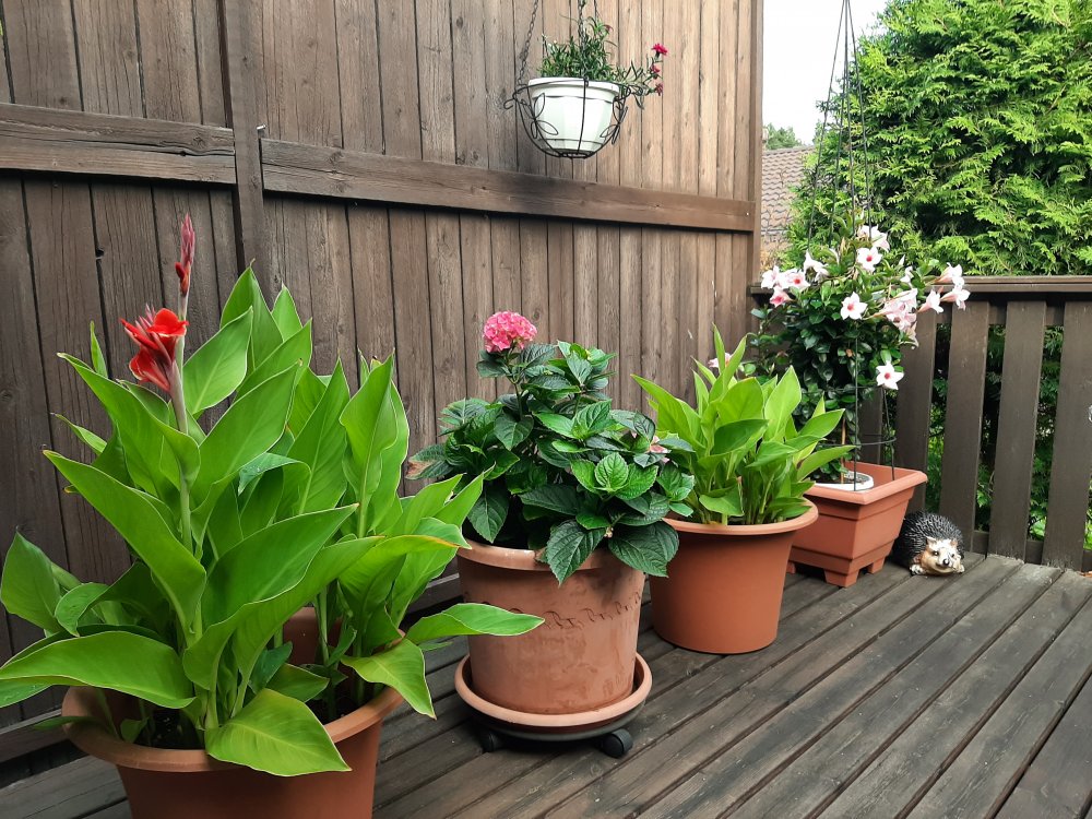У нас канны (ближние к объективу) решились всё-же зацвести. Красные начали, жёлтые ещё не готовы (дальние).