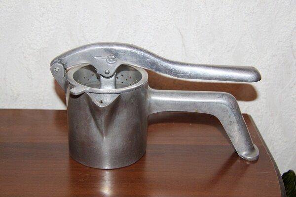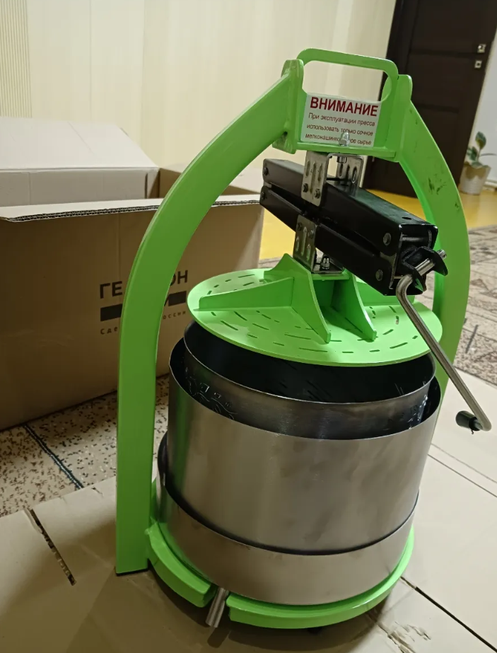 У меня покупной. Слабоват. Надо закреплять станину на столе жестко и ручку приваривать побольше, а не то, что там стоит. Пока отжимал, на обоих руках (предплечьях) синяки набил - одной рукой крутишь, второй станину удерживаешь, потом меняешь руки. Лучше для этого центробежную покупать, а таким прессом, как у меня, разве что спелую малину с клубникой жать и то уже сомневаюсь. Вот типа такой