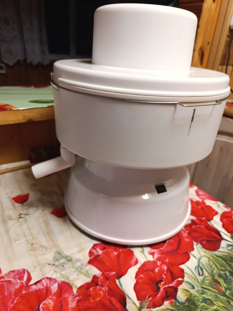 Про соковыжималки. А присмотритесь к вот этой модели. Называется "Салют". очень мощная, жмых (на фото) досуха отжимает. Кручу на ней яблоки в огромных количествах на сидр и на сок. Томатный сок делаю тоже. Рябину, кмк тоже отожмёт.