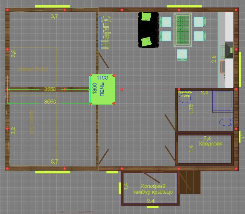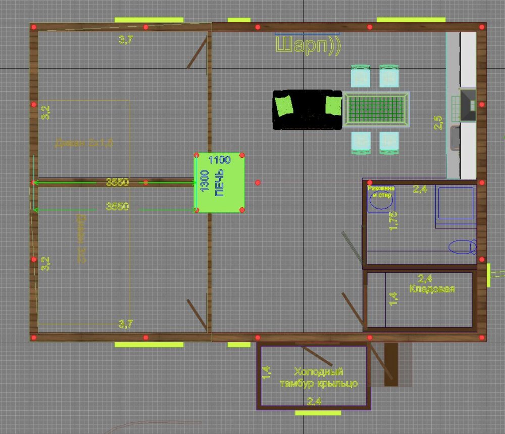 Двинуть надо спальни с печкой вправо, туалет влево. Столбы от коня желательно на сваи должны опираться.