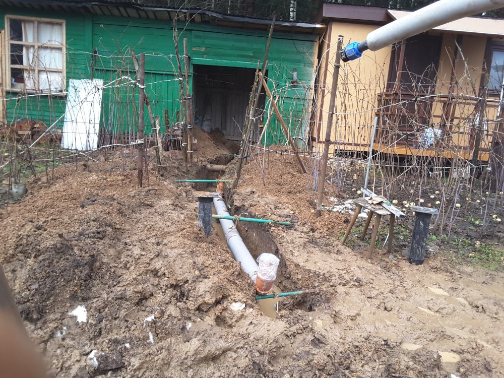 Так вот, плюсы сегодняшней погоды были ниже, крышку покрасил маслом. Минусы, когда подошел к траншее, везде вода млять! Метр почти. А мне канализацию вести. Хорошо с вечера чуть укрепил стены подземного ввода воды в новый дом. Досками и фанерой. Да и то все это дело чуть не затянуло к вводной трубе. Фоток нет, так там ходить было сложно, кг 10 на сапогах тащишь А тут еще фотик таскать. И сам как на этом фото почти. Разве что без намордника. Ввод сделал так, Приходящая с кессона 110ка рыжая в тройник110 и далее в рем муфту с переходом 110х50 на конце. Ну и вертикально 110ка в дом. В 110ом тройнике еще тройник, уже пндэшный 25ый, дальше переход с 25ой на 20ю и пошла труба в летний(теперь зимний домик). А вертикально на почти метр 25я, далее кран, еще метр и заглушка. В вертикалке 110ой выпилил лючок под кран, одел утеплитель, вроде иффсе. Ну и кабель питания насоса в гофре там же болтался. Короче, вернемся к нашему прудику в траншее, коекак запихал в нишу тех колодца остатки обрезки эппса и стал закидывать бякой, в которую превратилась глина нашего участка. Моя не осталась в стороне, хоть и болеет до сих пор, гребла как могла лопаткой. За что ей большое человеческоеСПС! Все как на Ры! Своих не бросаем! Косяк один, как пихать кабель обогрева под будущий дом? Просто в 110ю трубу. Думаю куйня получиЦа. Времени мотаца в леруа за кабелем не было, так бы накрутил, завтра уже морозец обещают, и мне те котлованы мороженной глиной было бы ой как сложно закидывать.
