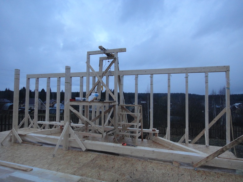 Предварительно соорудив "гильотину" к которой была подвязана электрическая лебёдка и метров 20 альпинистского троса. Аккуратно привязав брус по центру, нажал кнопку генератора (электричества ещё не было) и кнопку лебёдки.