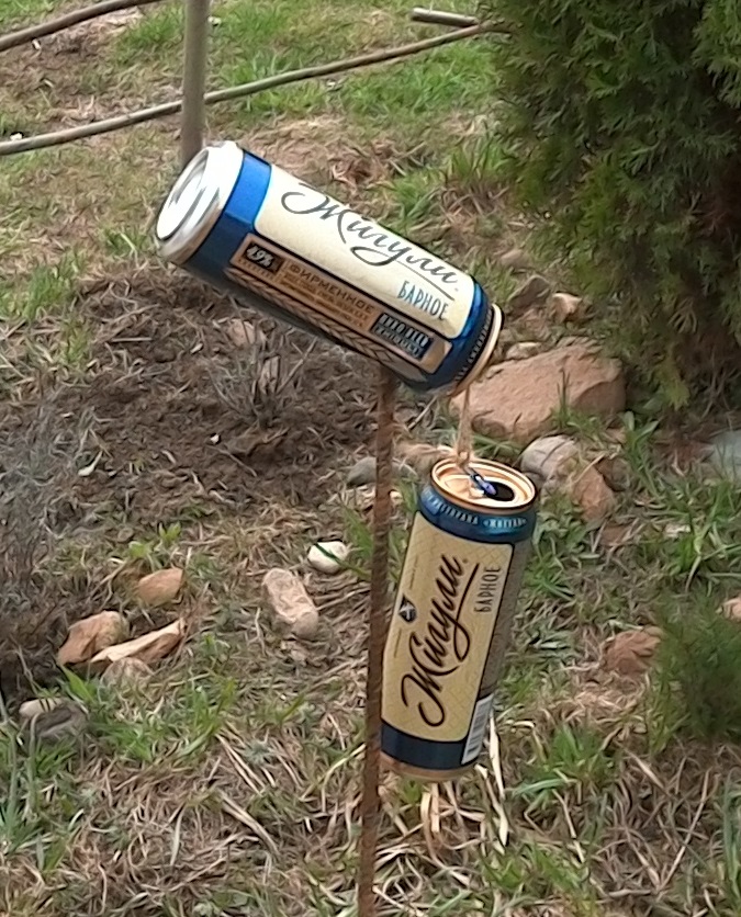 Прямо напротив меня, почти под кормушкой, где до сих пор снегири вьются, болтаются на палке остатки такой трещотки из пивной бутылки.