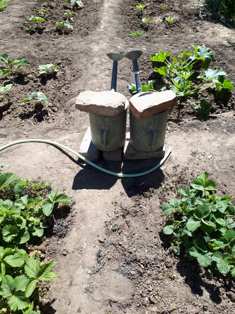 20. в лейках с водой рыба или еще что то настаивается для полива, кирпичи что бы вороны рыбу не сп.....и.
