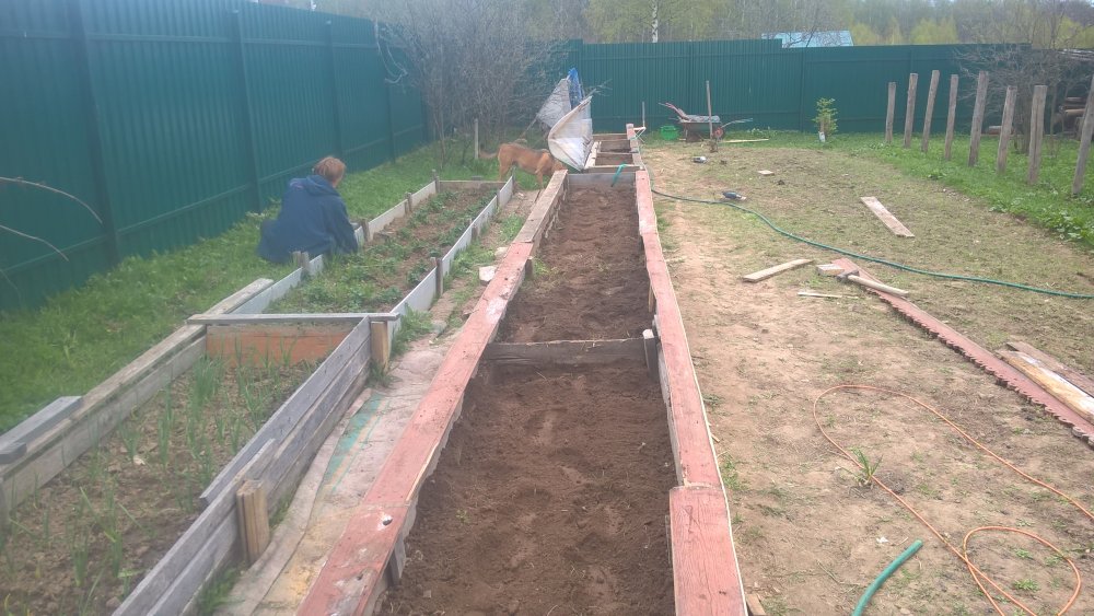 Майская фотка, исчо без поджопной доски, как на правой грядке. Вот Ненаглядная и мучается. А правую прошел культиватором - красота. Один хрен на ней все помидоры открытого грунта почернели. Теперь только в теплицах.