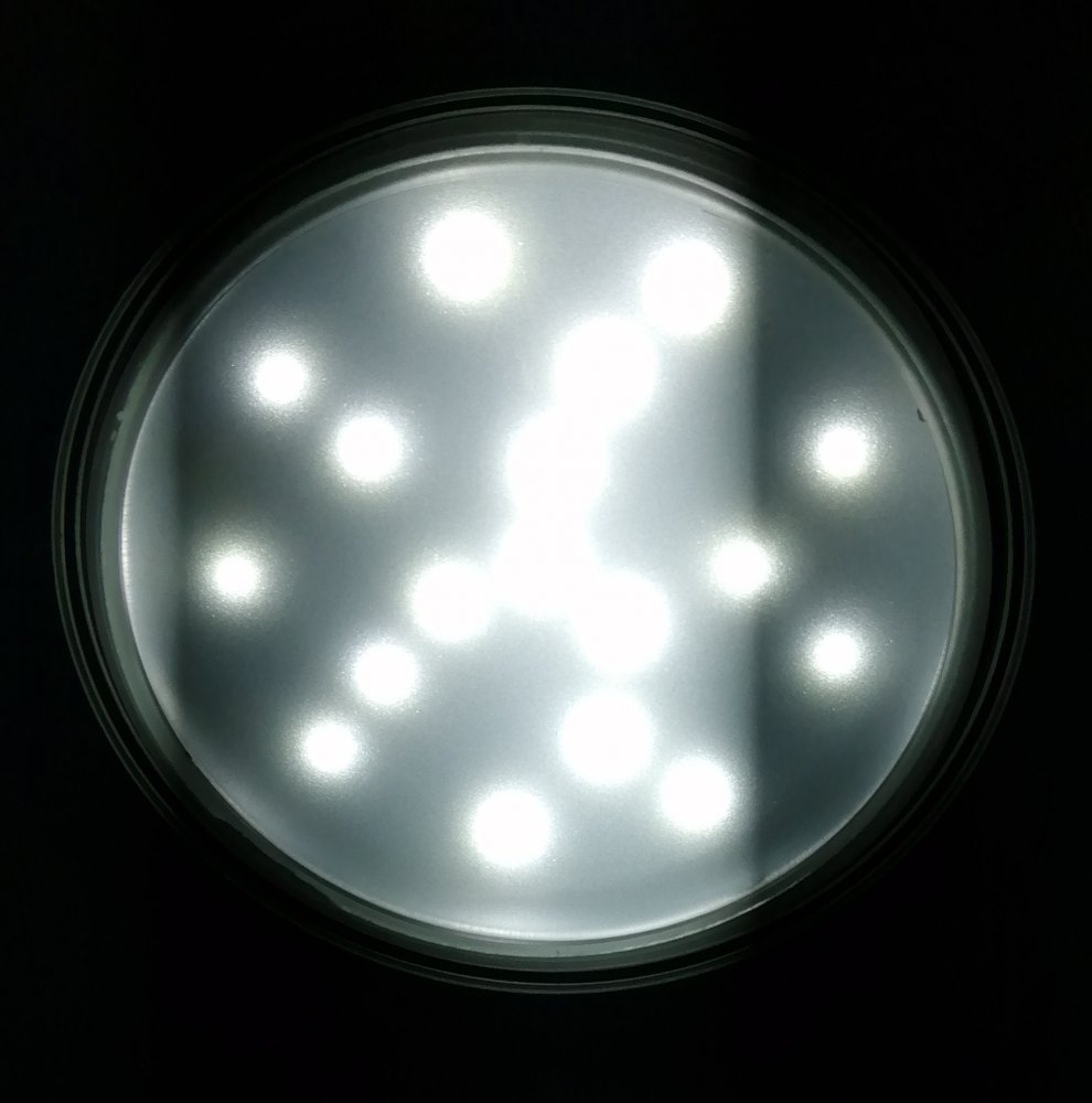 У меня в коридоре на антресоли приделан. Диаметр 150мм вместе с обечайкой. Светит - глазам больно. Года четыре висит. В леруа подобных, как говна за баней. Сколько стоит, не помню. Сейчас поищу в леруа.