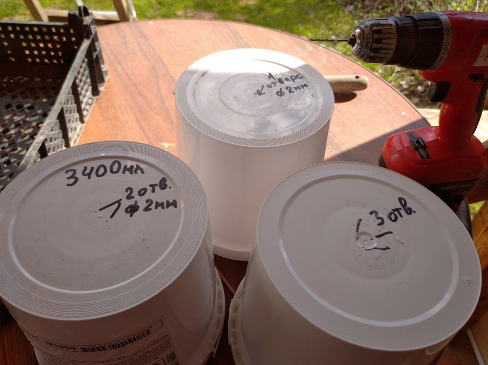 @РАН, Взял 3 ведра по 3400 мл. Просверлил 1 во втором 2, а в третьем 3 отверстия диа 2 мм. Вода быстро уходит. Воткнул в отверстия по зубочистке, в 8:49. Наблюдаем.
