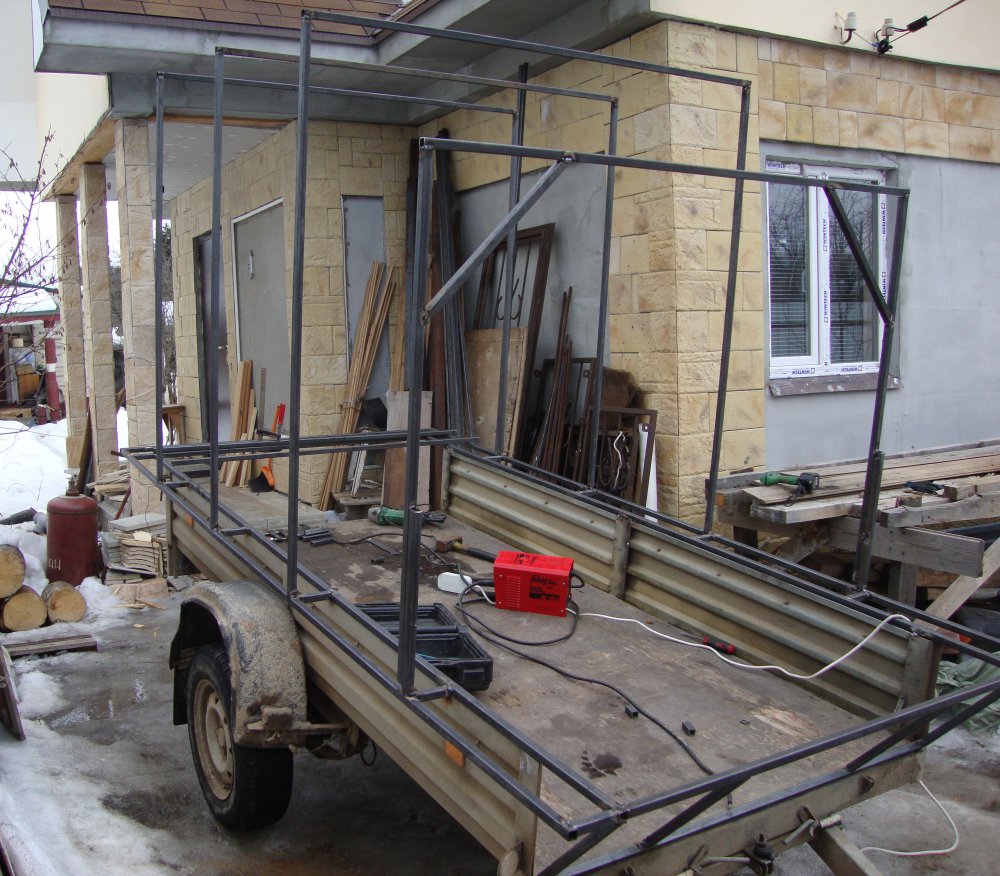 Поскольку прицеп у меня 2.45х1.2,и снеж я возил откинув передний борт с ..лыжами наружу..,пораскинув умишком понял что борта у меня лишняя часть,загнав снеж и покумекав на конструктив решение принял.Спальник должен быть по ширине минимум 1.5 метра,иначе вдвоём не сон ,а толкание локтями,длинна его будет 1.9,итого 1.1 метра у нас получается прихожка,где можно будет поставить небольшой столик.,и останется место под ботинки ,иль сапоги.Вобщем расширяемся над бортами ,поднимаем стойки,и при росте 1.74,я незадеваю головой.Спереди будет на скос.Конструкция и так довольно высока,но не ползать же скрючившись?Пока примерочно выглядит так,сзади сварено наглухо пока ,для удержания размеров,потом центр будет вырезан..Спереди скос ,лыжи как раз закругления будут на него заезжать.