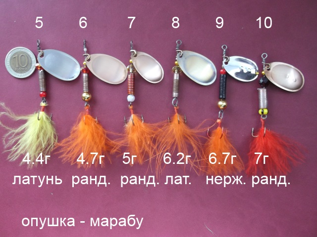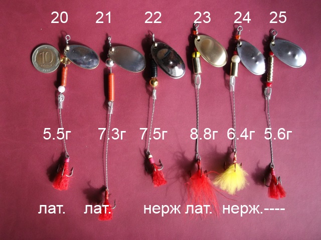 Блесны изготовлены из цветных металлов, не крашенные, не лакированные. Угол раскрытия около 40 град. Опушка из пера марабу, при намокании , напоминает червячка. Стоимость блесен с пропеллером и двойным лепестком - 120р, остальные по 100р. Отправляю почтой за счет покупателя.