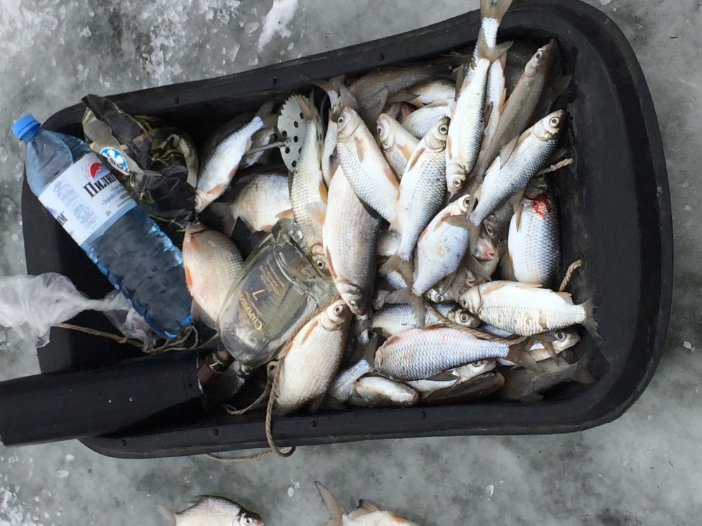 Митинка с.Заволжское,мороз 12 градусов и сильный ветер 24км/ч,но клев отменный,за 4 часа с женой поймали 7.5кг бели ,ловили в палаках.наживка мотыль,на течении...