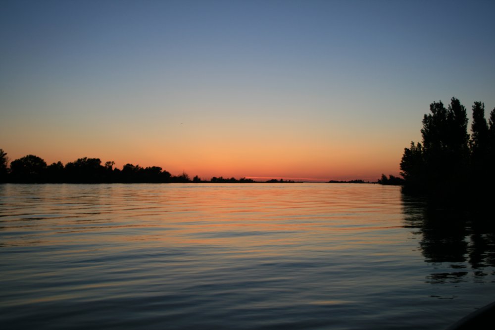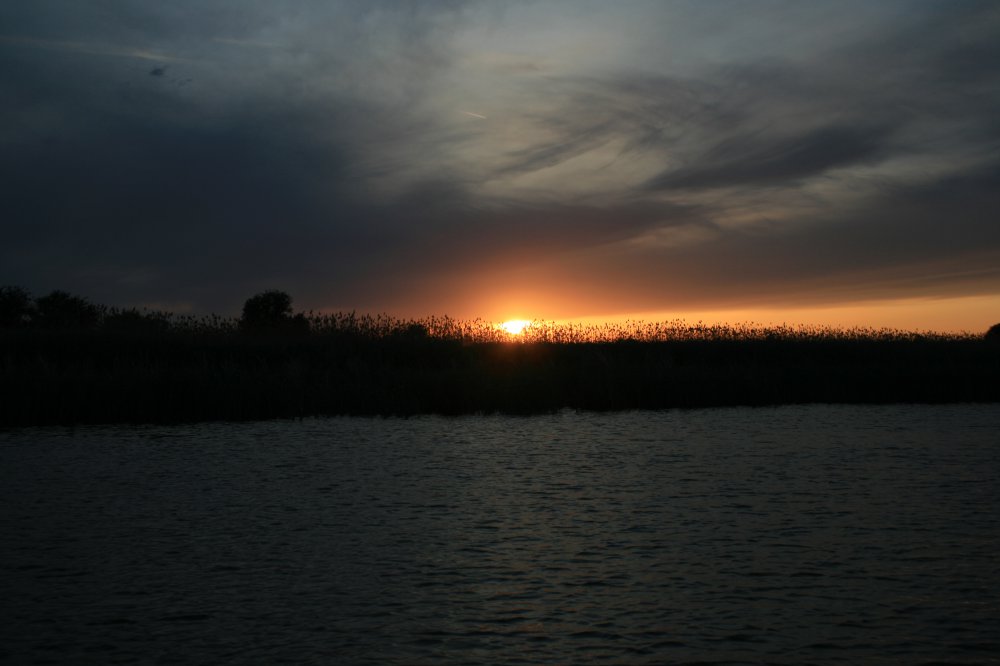 Следующий день тоже нас немного удивил:) Плывем по тихой заводи среди камышей, и вдруг напарник замечает, что под лодкой нагло лежит сом. Ну как же не попробовать его поймать. Егерь решает завести его в подсак. Заводит..заводит...момент истины.. Над лодкой взвивается хвост, бабах..все мокрые... а сом согнув к чертям собачим железный подсак, и провернувшись три раза уже чертит пузырями на поверхности воды к ближайшим камышам. По оценке егеря сом тянул килограмм под 30.