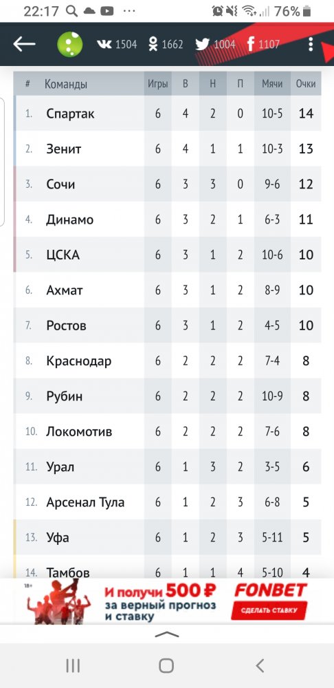 Ну таблица не весёлая, но поражение от Рубина это конечно договорняк товарищеский, который сорвался на последней минуте, если бы не это дерьмо, поражения от Зенита и ничья с Краснодаром, это всё таки гостевые игры и играли, с Зенитом, точно не плохо. Не нужная потеря 3-х очков с Рубином, вот боль первого этапа чемпионата, но лидер не далеко, 13-го очная встреча, всё в наших руках, есть две недели, первое что нужно - наиграть новую пару нападающих, "вороной" понравился, но никого пока не видит, а дриблинг хороший и рывок очень быстрый, к нему в пару длинного Гаича и может неплохо получиться.