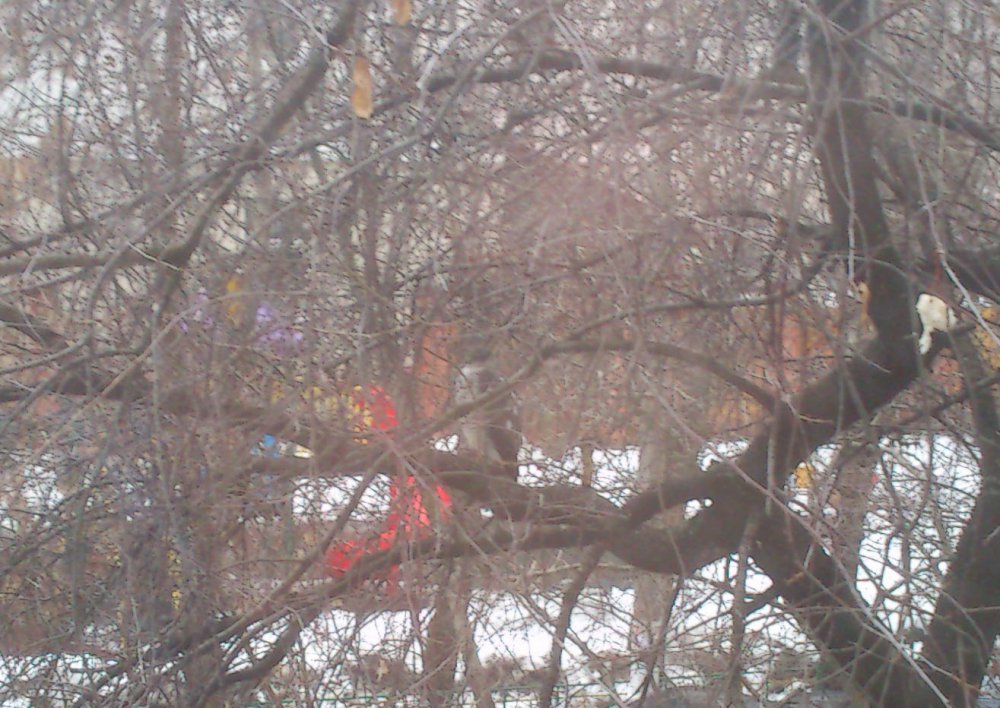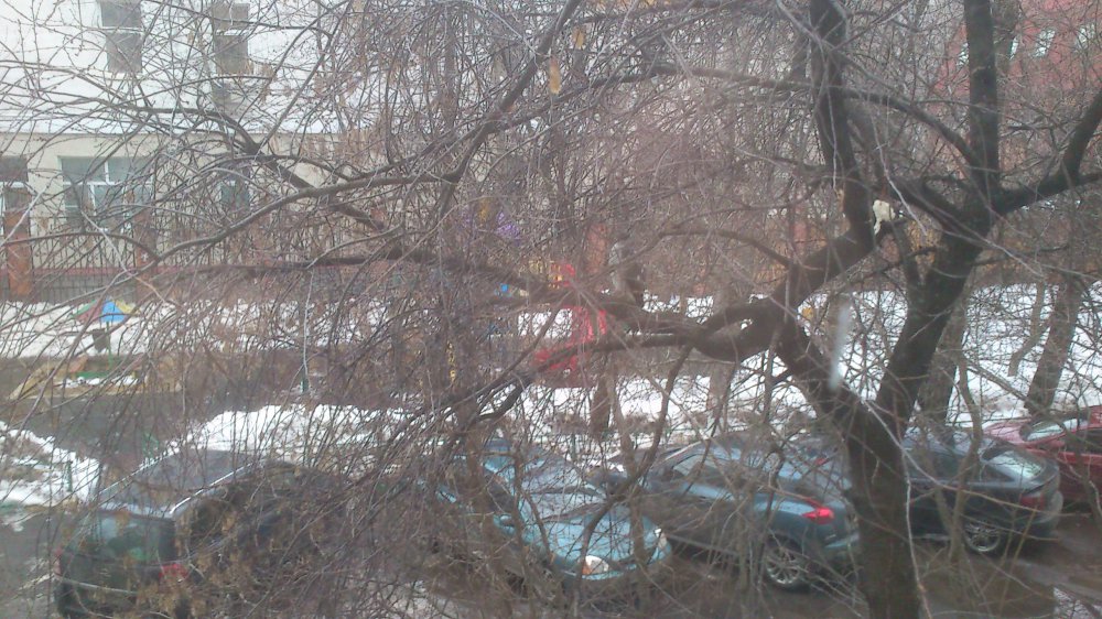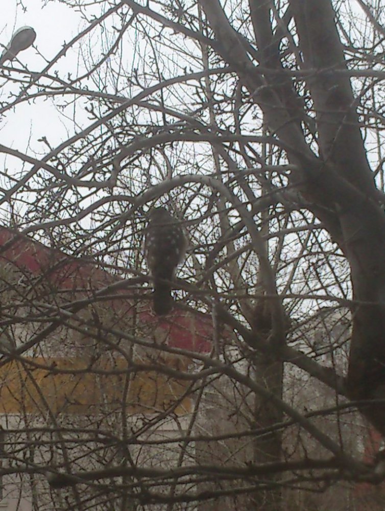 У меня около окна кормушка для синиц, и сегодня что-то они сильно расчирикались. Глянул в окно, - на ветке вишни сидит ястреб-перепелятник! А наглые синицы крутятся у него под самым носом и ругаются. Прилетает он уже не первый раз. Один раз здесь же потрошил какую-то птичку. Естественно в фотоаппарате нет батарей - снял на телефон.